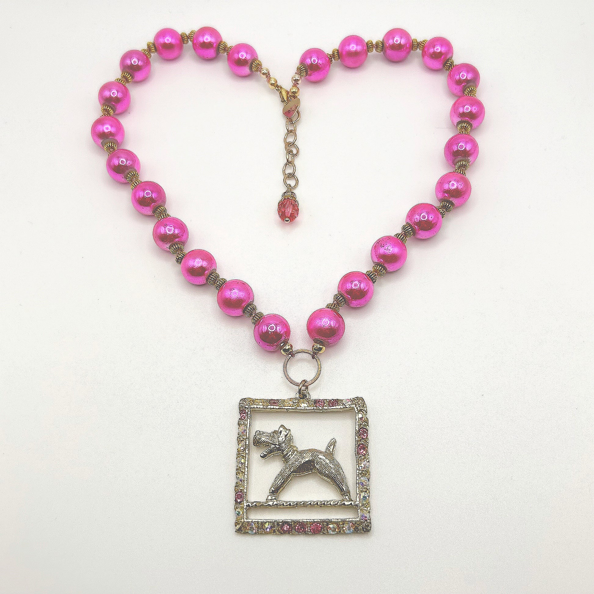 This amazing vintage dog pendant can only be described as whimsical. I added some hot pink glass beads for a fantastic and fun piece! Are you bold enough to wear it?
